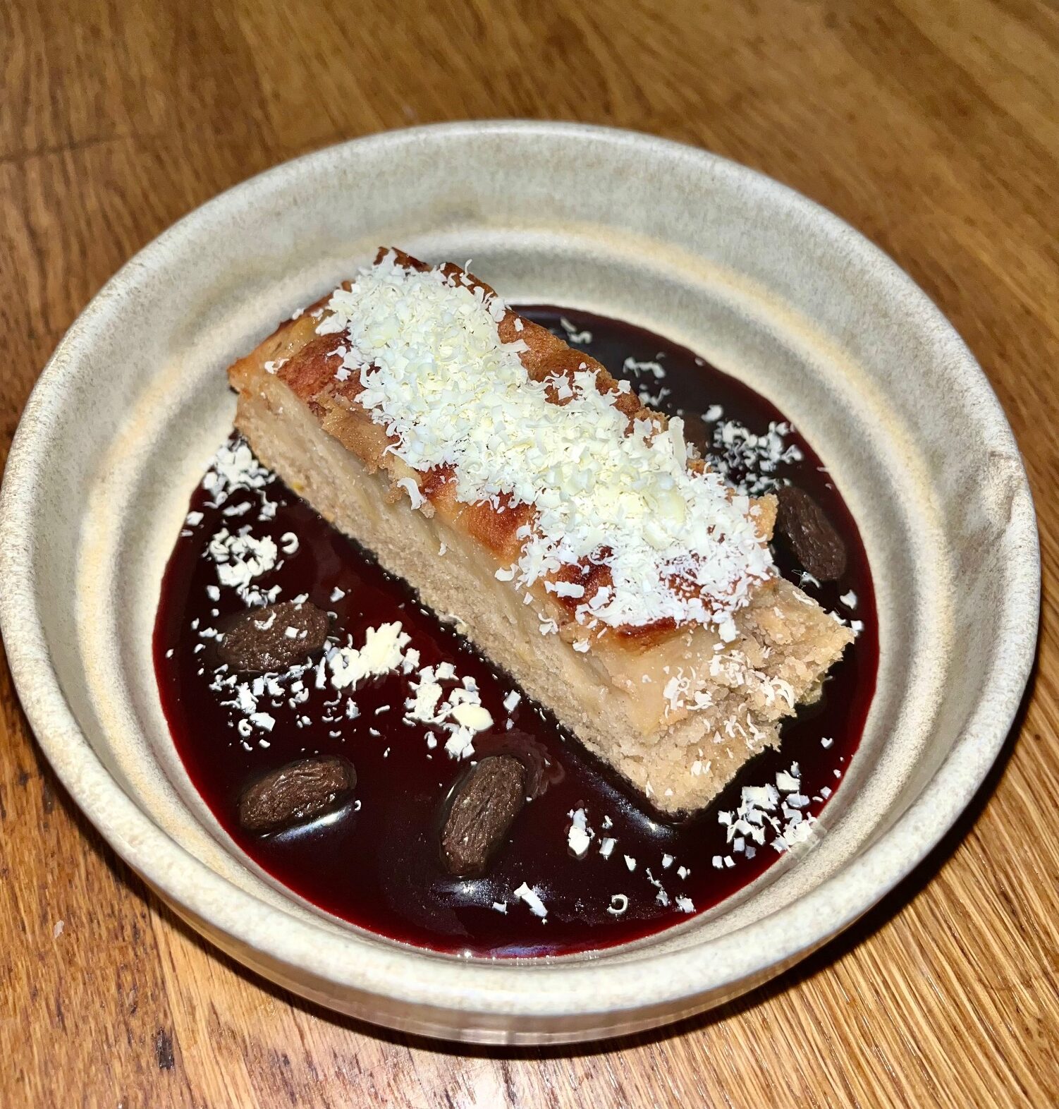 mollejas de cordero lechal empanadas con demiglace y crema de ajo asado.